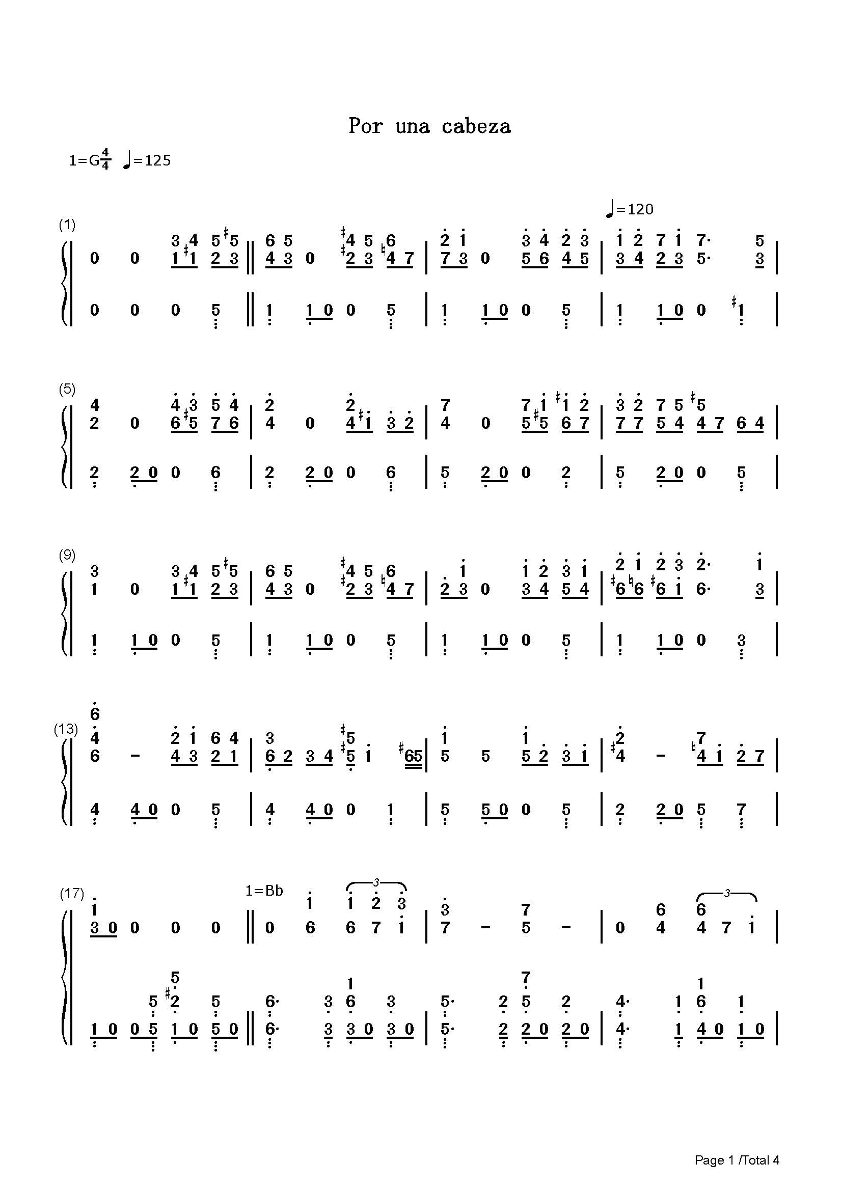 《Por Una Cabeza》(只差一步)是一首著名的西班牙语探戈歌曲。1935年由阿根廷歌手卡洛斯·葛戴尔作曲,亚法多·勒佩拉作词完成。西班牙语中的“Por una Cabeza”本为赛马的术语,意为“差一个(马)头”的长度。在歌曲中用来表示对情人之间错综复杂难以割舍的惋惜。这首Tango风格的曲子,曲式为ABAB,首段呈现慵懒幽默的口吻,进入到B段转小调,转而呈现激情的感觉,接着又转回大调。由小提琴和口琴作对位和声的表现。两个部分那种前后矛盾而又错落有致的风格充分的展现了探戈舞中两人配合的默契。这首华丽而高贵动人的探戈名曲,出现在众多电影配乐中,是阿根廷探戈舞曲的极致代表,也是全世界乐迷所最为熟知而深深爱上探戈旋律,由阿根廷史上最负盛名的阿根廷探戈无冕之王 Carlos Gardel(卡洛斯·加德尔)所作。自诞生以来,成为电影中探戈的首选舞曲,钢柔并济的旋律似乎适应着每一个角色的心理任何一个场景的铺垫。