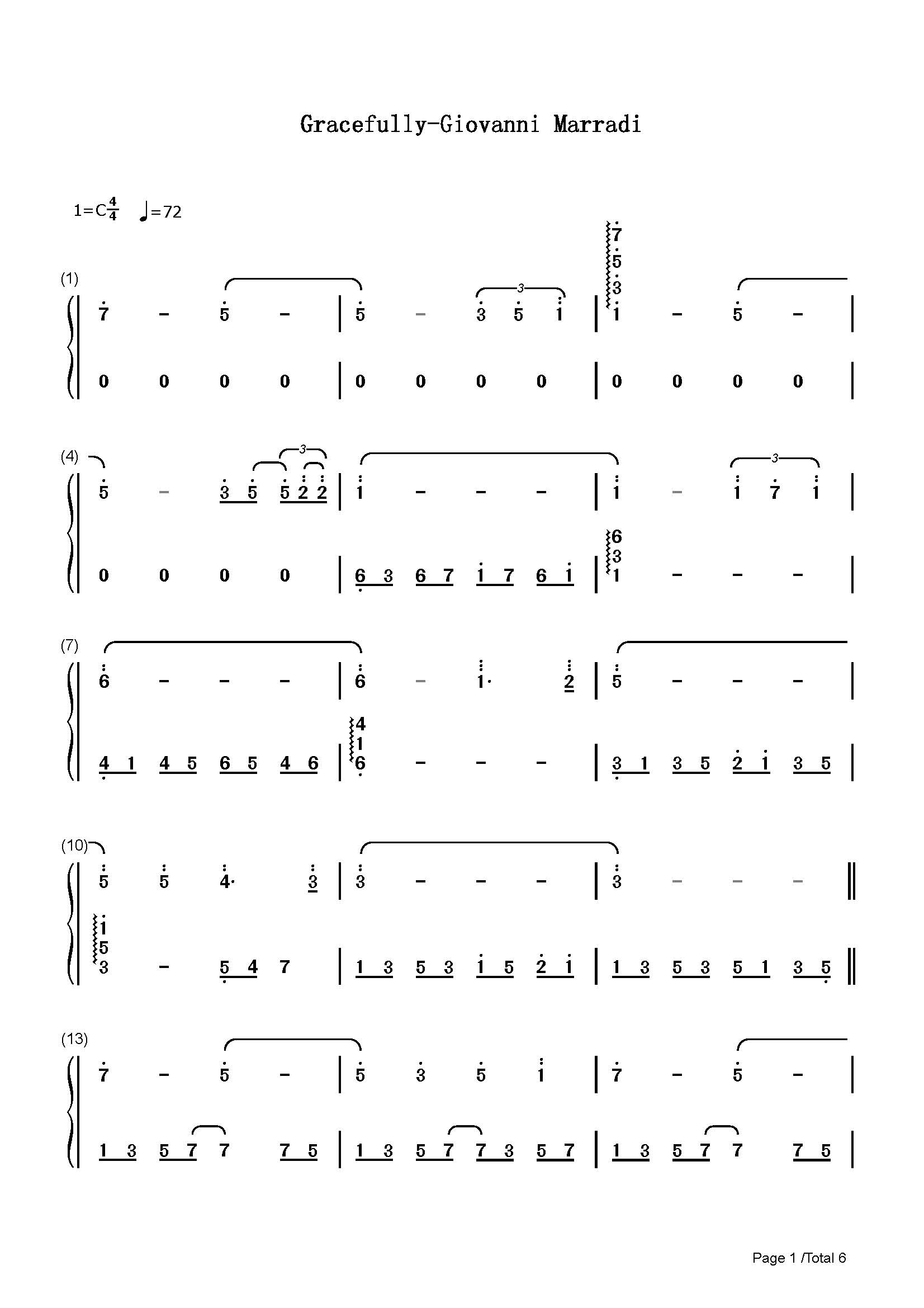 Gracefully是钢琴诗人乔瓦尼·马拉蒂 (Giovanni Marradi)的一首经典钢琴曲,收录在同名专辑里。乔瓦尼·马拉蒂 (Giovanni Marradi) 出生在意大利,5岁开始步其父亲后尘练习音乐演奏,8岁开始学作曲。现在已成为世界著名的NEW AGE音乐作曲家和钢琴家。Giovanni 的钢琴音乐犹如清晨荷花上的露珠,晶莹、透明;有时又象森林深处夜莺的私语,饱含不食人间烟火的凄美。Giovanni 的钢琴音乐犹如清晨荷花上的露珠,晶莹、透明;有时又象森林深处夜莺的私语,饱含不食人间烟火的凄美。聆听Giovanni的音乐 你会觉得是在读一首首的抒情诗,又象在欣赏一幅幅的风景画……下方是Gracefully钢琴谱,希望大家喜欢。