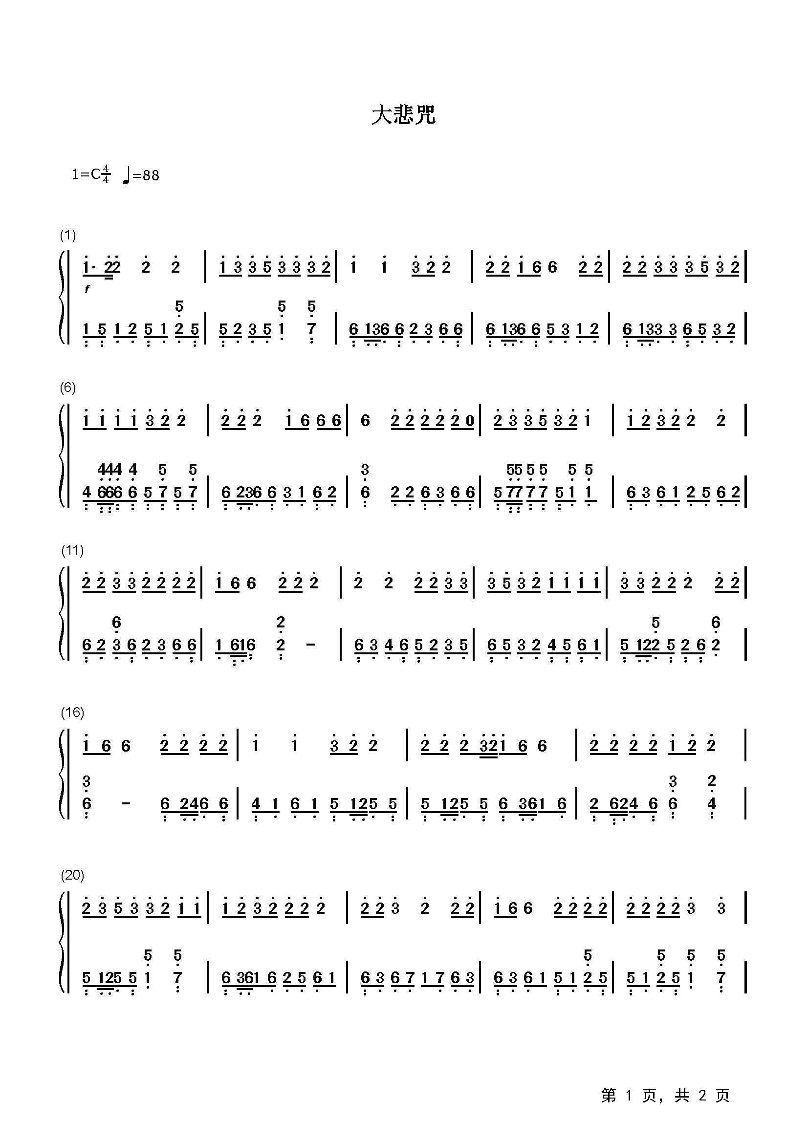 《大悲咒》是一首佛教歌曲,出自“伽梵达摩”所译的《千手千眼观世音菩萨广大圆满无碍大悲心陀罗尼经》,全名为《广大圆满无碍大悲心陀罗尼》。按照内容文字的多少,《大悲咒》有广、中、略三种不同的版本。现今通行的“伽梵达摩”84句《大悲咒》,其经本以《大正藏》的底本为依据,是一个变化差异较大的晚期增改本,并非“伽梵达摩”译本的原始面貌。除此类藏经外,还有一些很重要且更准确的可参考文献。如与译经年代较接近的敦煌抄本、房山石经,以及与汉译本多有一致的西藏大藏经等。《大悲咒》在汉传佛法中具有极其重要的意义。自唐代翻译《大悲心陀罗尼经》之后,《大悲咒》即广为弘传,并被纳入汉地丛林功课。据《大悲心陀罗尼经》载:《大悲咒》是观世音菩萨为利乐一切众生而宣说,其利益功德广如大海而叹莫能尽;无论是消障除难、得善遂愿,还是究竟的觉证解脱,《大悲咒》都能因其不可思议的大方便威神之力广为利乐。因而有不在少数的佛门四众,寄於虔心持诵《大悲咒》以自利利他、护持佛法。