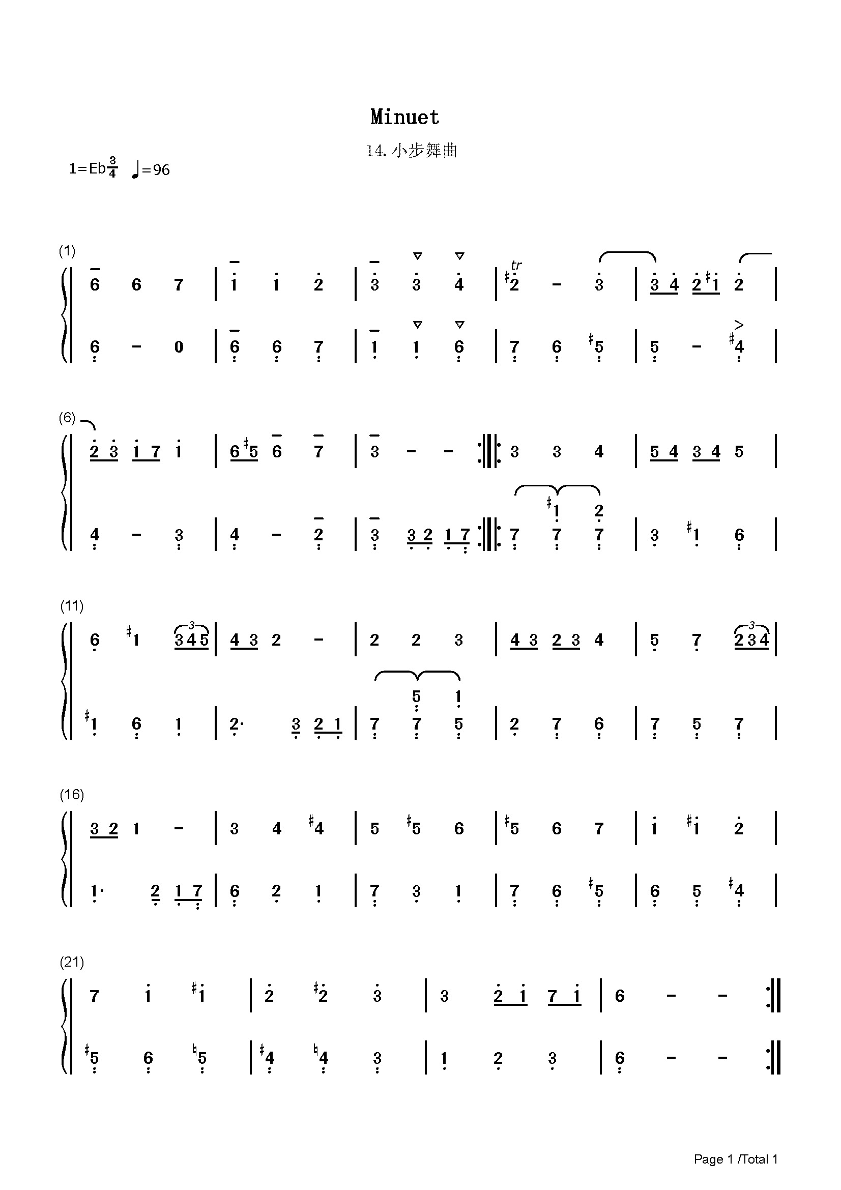 小步舞曲-14钢琴谱-巴赫-降E调 -古典钢琴简谱