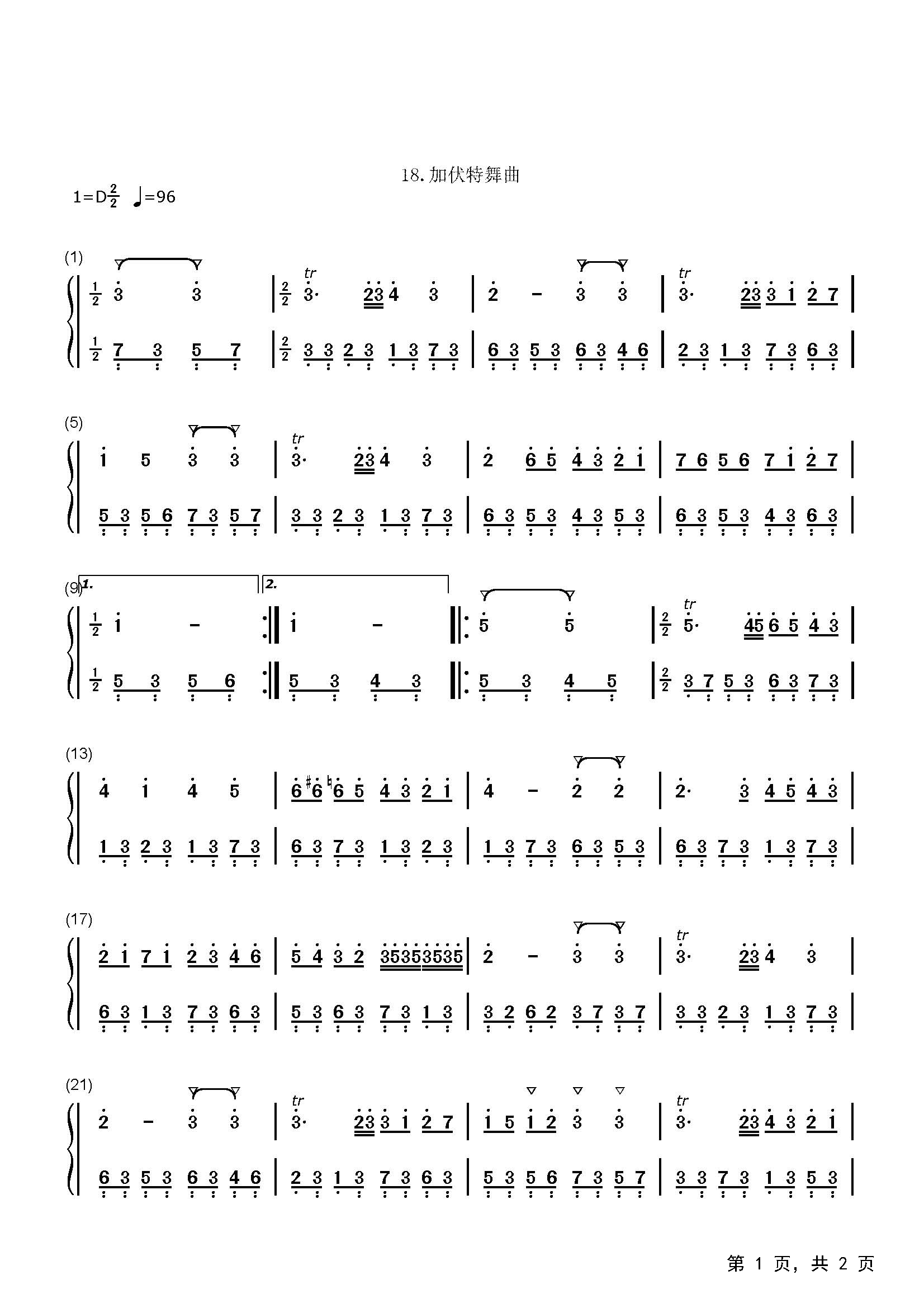 《加伏特舞曲18》是巴赫初级钢琴曲集中的一首。巴赫,巴洛克时期的德国作曲家,把西欧不同民族的音乐风格融为一体。他集意大利、法国和德国传统音乐中的精华,曲尽其妙,珠联璧合,天衣无缝。加伏特原是法国古代民间舞曲。17世纪中叶由法国作曲家吕利(1632-1687)采用于歌剧、舞剧中,在法、德两国流行一时。其特点为中速,2/4或4/4拍,旋律轻盈优雅。常以包括两个四分音符的弱拍开始,各乐句通常从小节的中间部分起拍和结束。三段体结构,中段常插入风笛舞曲,前后形成对比。吕利曾将其采用于歌剧、舞剧音乐中。可独立成曲,也常用为器乐组曲的一个乐章。