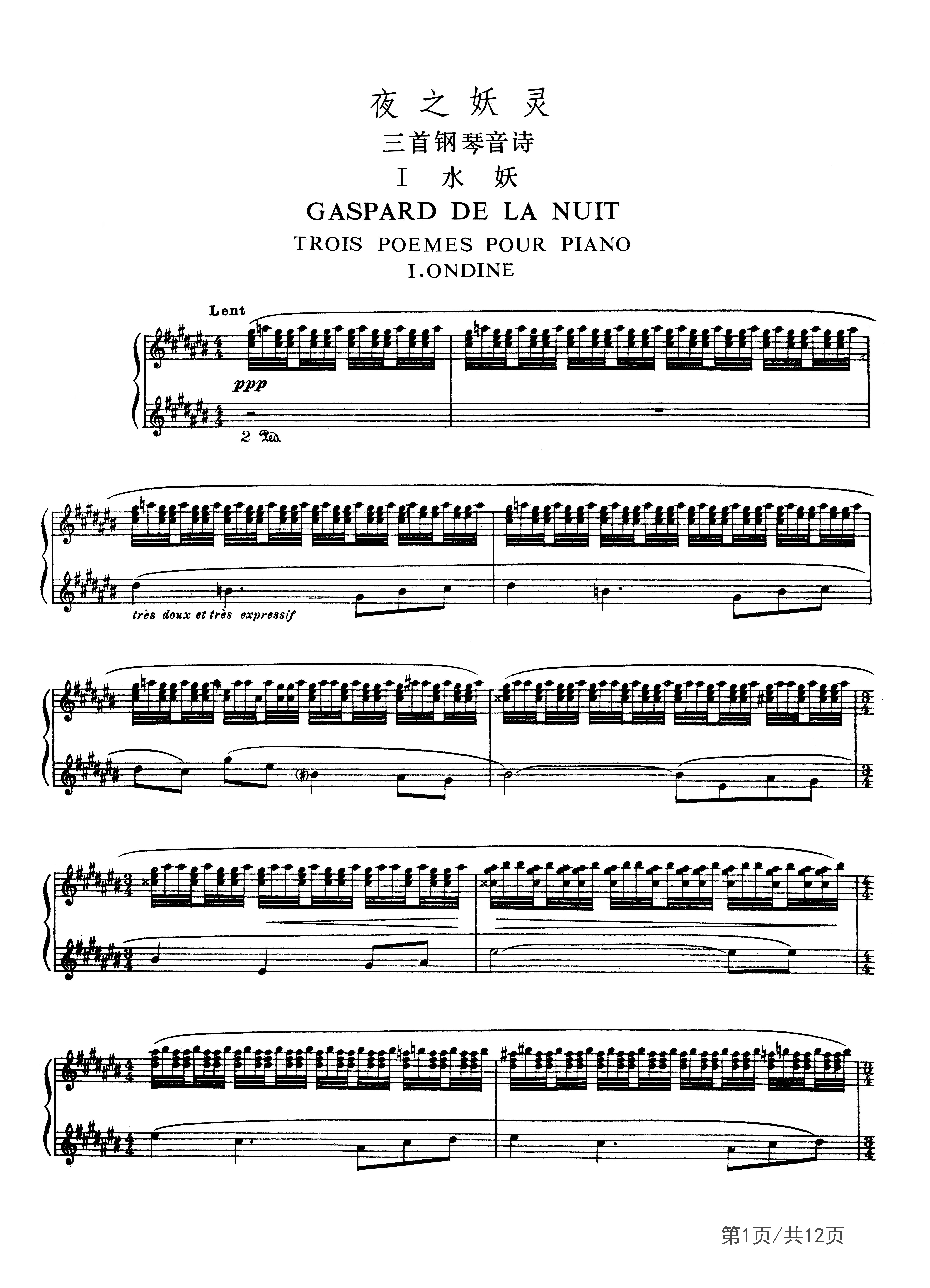 拉威尔-夜之妖灵-水妖钢琴谱-拉威尔-升C调-古典钢琴五线谱