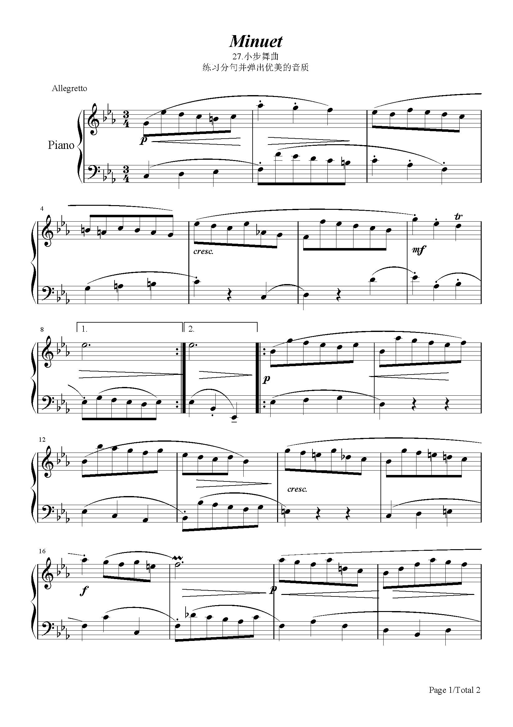 小步舞曲-27钢琴谱-巴赫-降E调 -古典钢琴五线谱