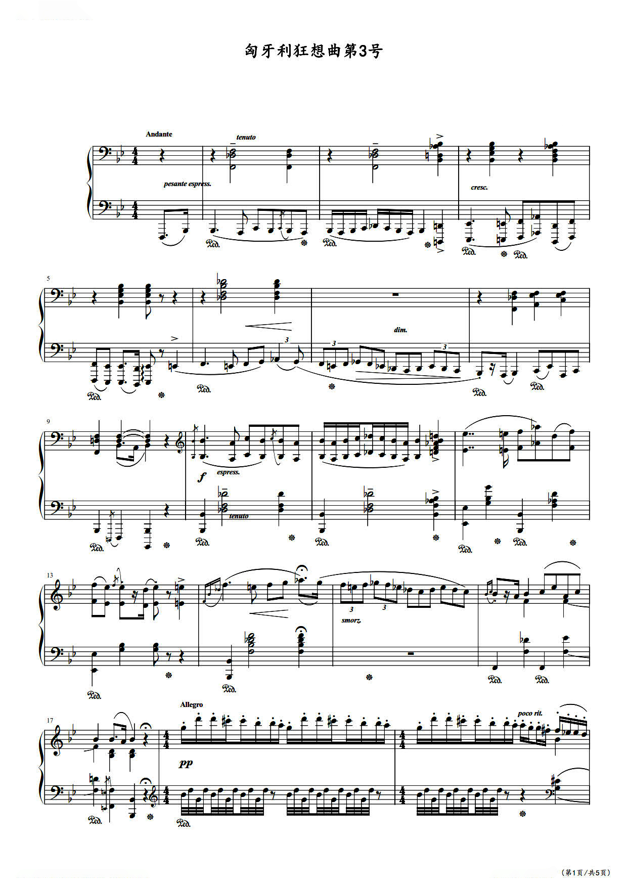 时而如葬礼般沉重、时而如幽灵般诡异的一曲。这种风格从头延续到尾,在李斯特的匈狂里是非常罕见的。 开头即用浓重的低音营造出压抑沉痛的气氛。而从17小节开始,是不是有忽明忽暗飘忽不定的鬼火般的感觉?23小节是一段凝滞、诡异的舞步。37小节出现了一刹那温暖的光亮,却又瞬间被突如其来的钢琴最低音打断。54小节开始是将两个主题巧妙结合,音符之中分明有着无奈的叹息和徒劳的挣扎。62小节的调子,可能是李斯特匈狂里最让人毛骨悚然的旋律。 反正,这是首很特别的匈狂,与我之前做的所有匈狂都是完全两个感觉,给我的意象竟然是死亡、葬礼和地狱之类……