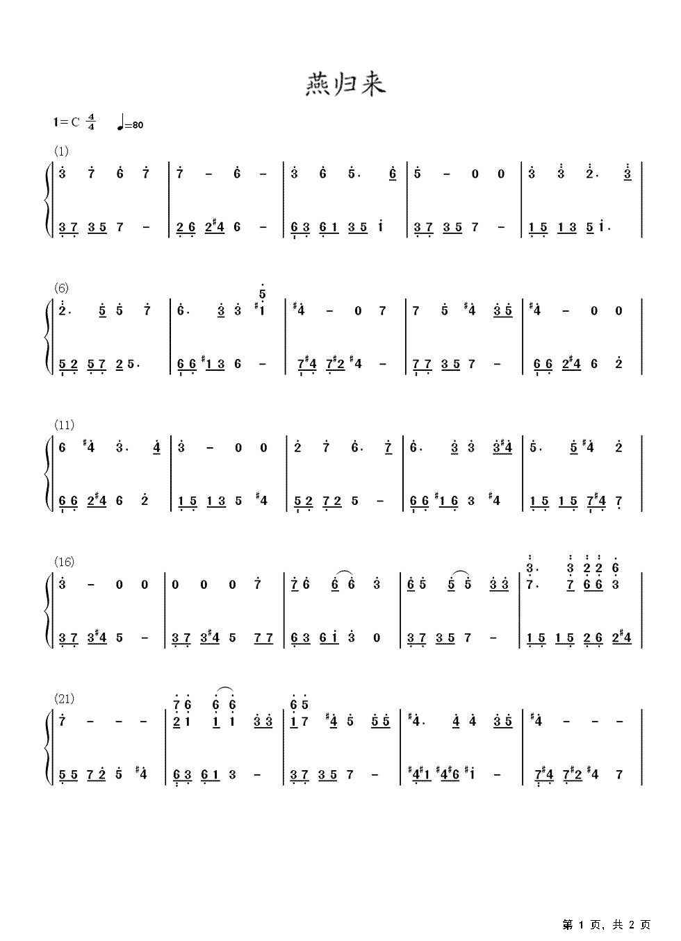 作品分类:流行钢琴简谱