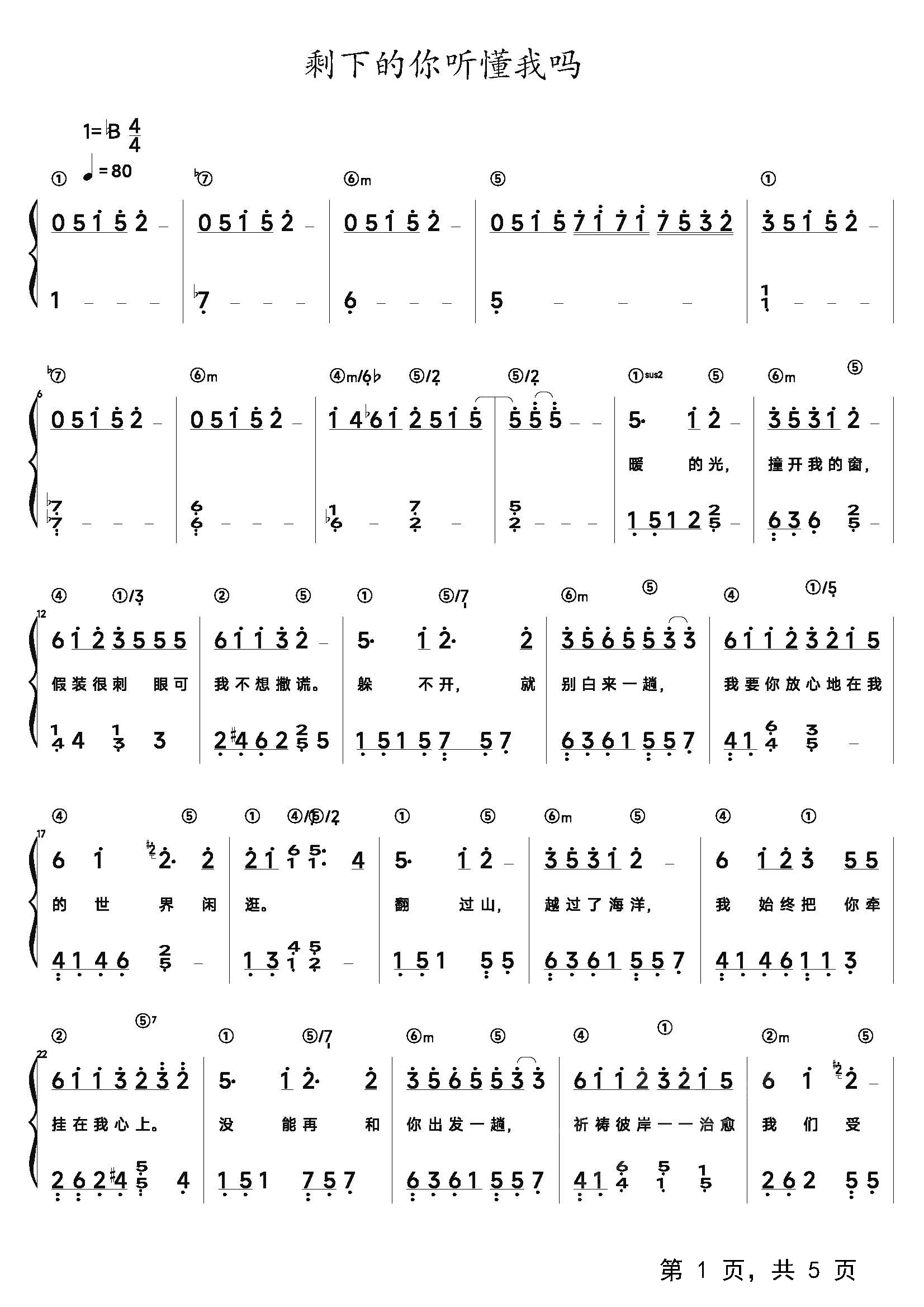 剩下的你听懂我吗钢琴谱-薛凯琪-降B调-流行钢琴简谱
