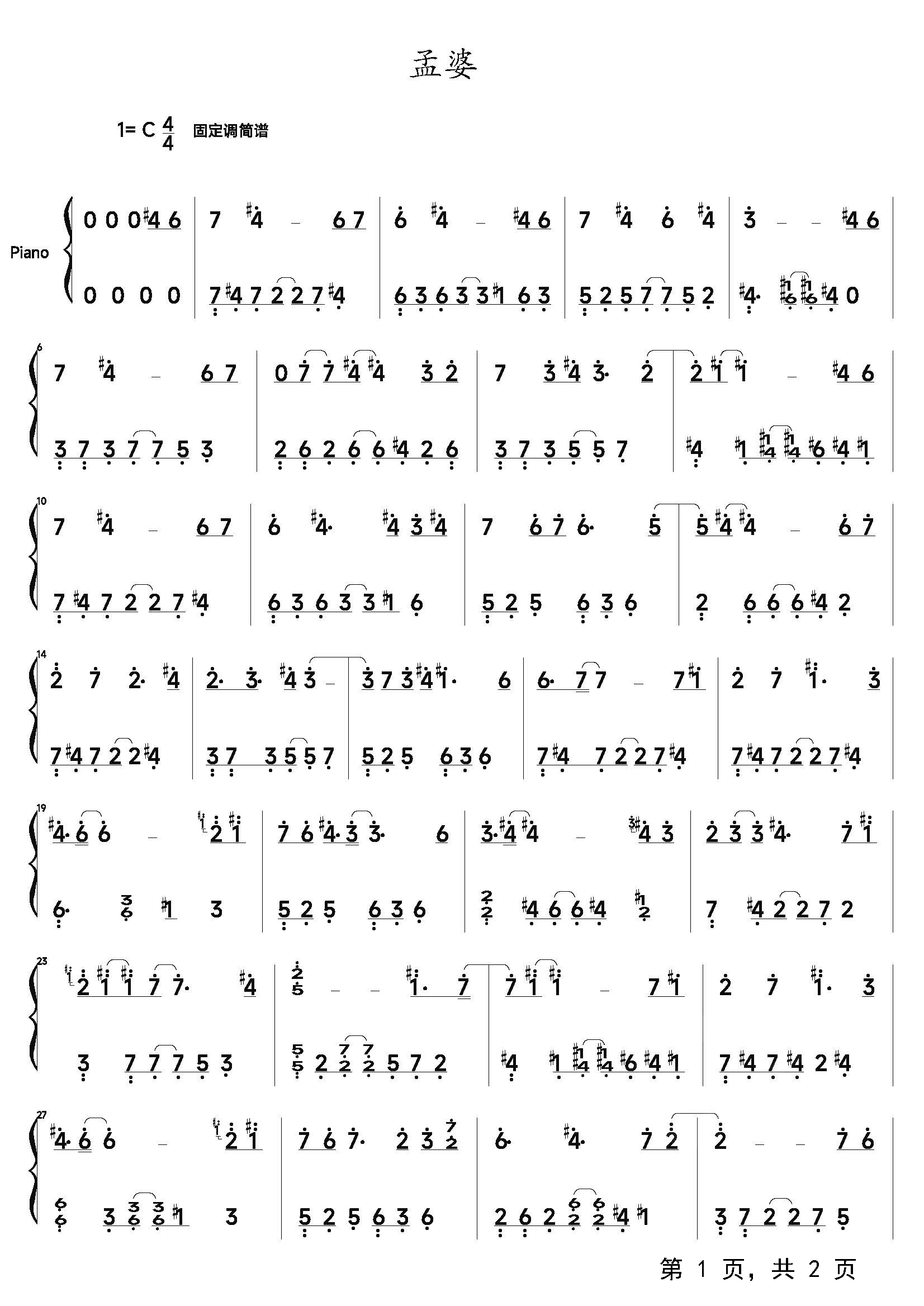 作品分类:流行钢琴简谱