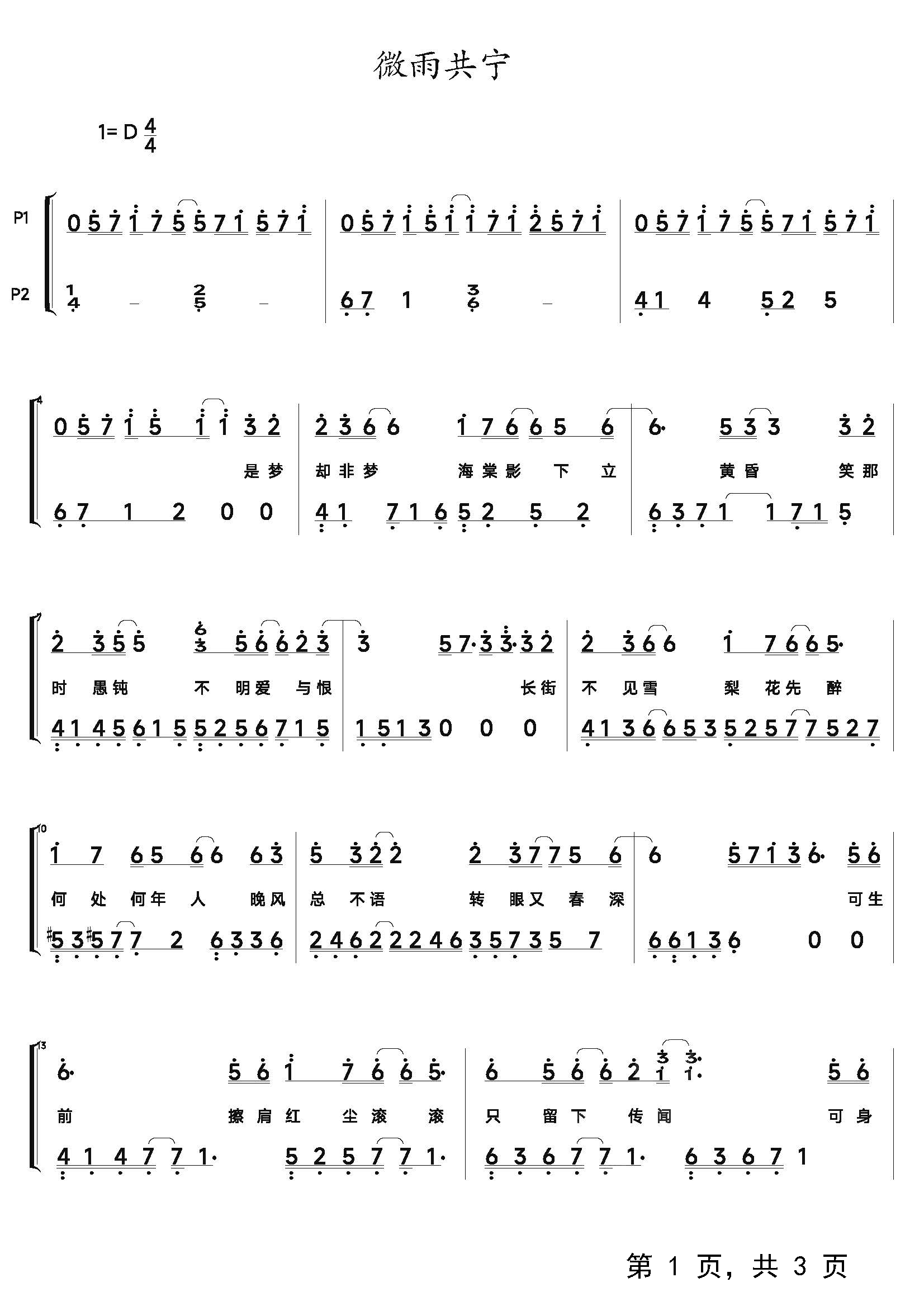 《微雨共宁》是由镜予歌、喧笑、刘小寒共同演唱的华语歌曲,2024年10月22日发行并收录于同名专辑,作为有声剧《二哈和他的白猫师尊》主题曲推出。该曲由袁雨桐担任制作人,镜予歌原创音乐工作室制作,歌词由芒果冰沙柠檬水创作,编曲融合吉他、二胡等传统器乐元素。歌曲以古风旋律为基调,通过“海棠影下”“长阶梨花”等意象勾勒故事氛围,围绕情感纠葛与命运跌宕展开。男女对唱段落交织前世今生的执念与遗憾,副歌“风霜越跌宕”“爱恨盼寻常”呼应原著角色历经沧桑的心境,最终以“微雨轻落 万木逢春”的意境收束,暗示情感羁绊的延续与释然。