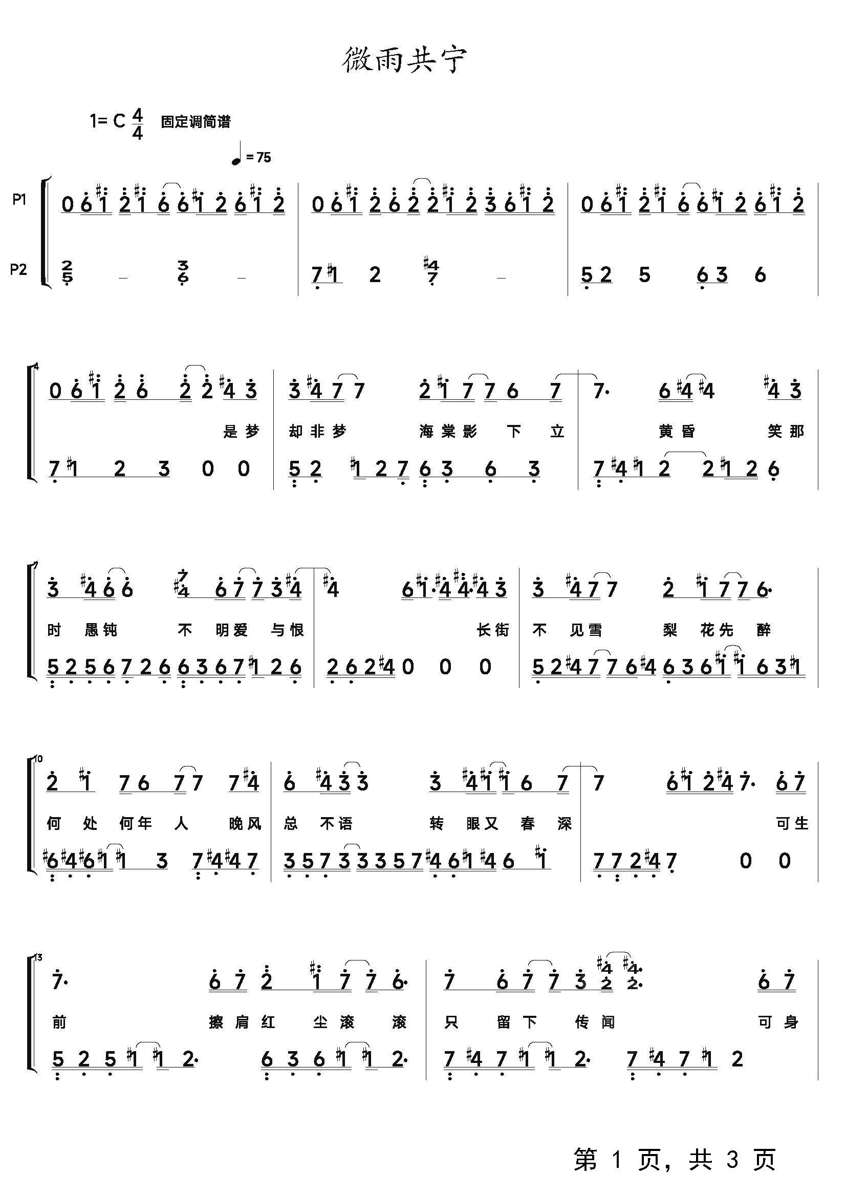 微雨共宁钢琴谱-镜予歌和喧笑和刘小寒-C调-流行钢琴简谱