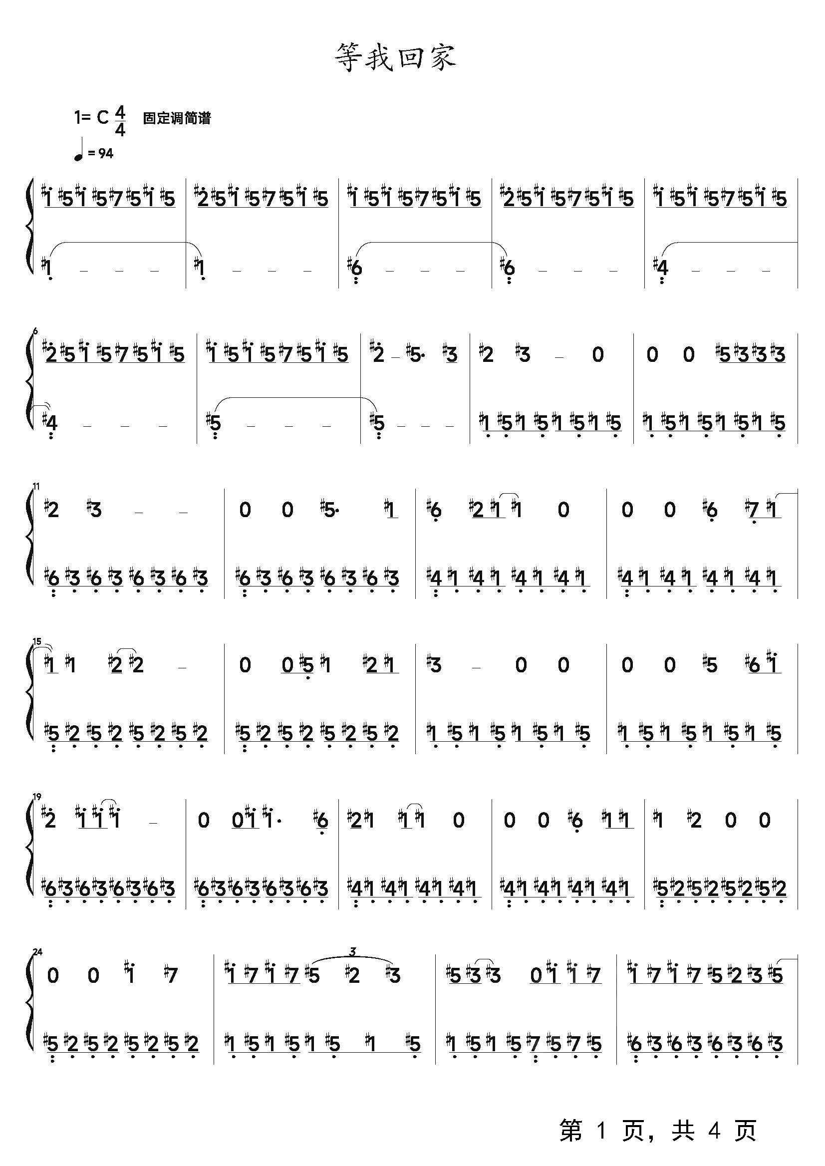 等我回家钢琴谱-薛之谦-C调-流行钢琴简谱