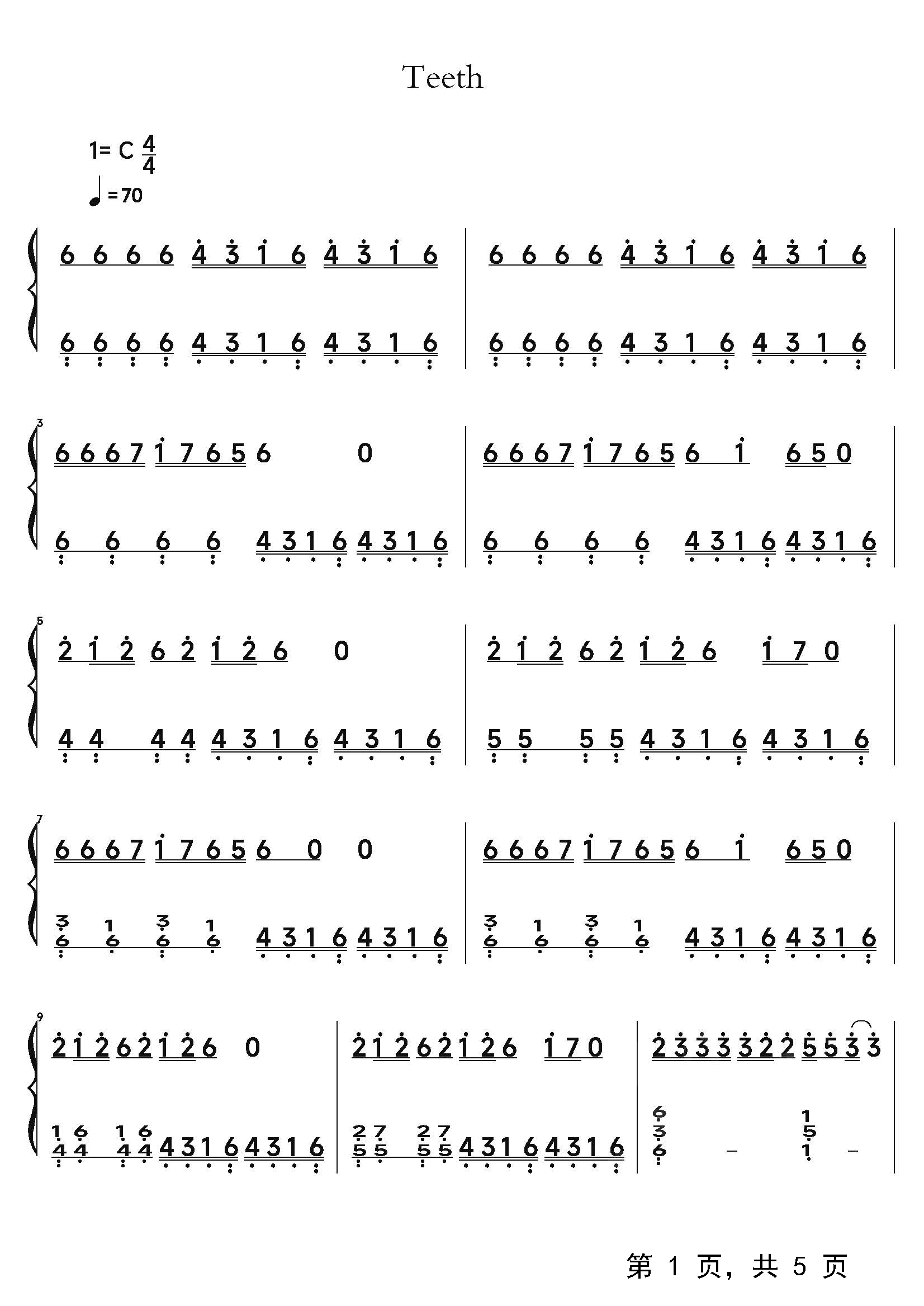 TEETH钢琴谱-五秒盛夏-C调-流行钢琴简谱