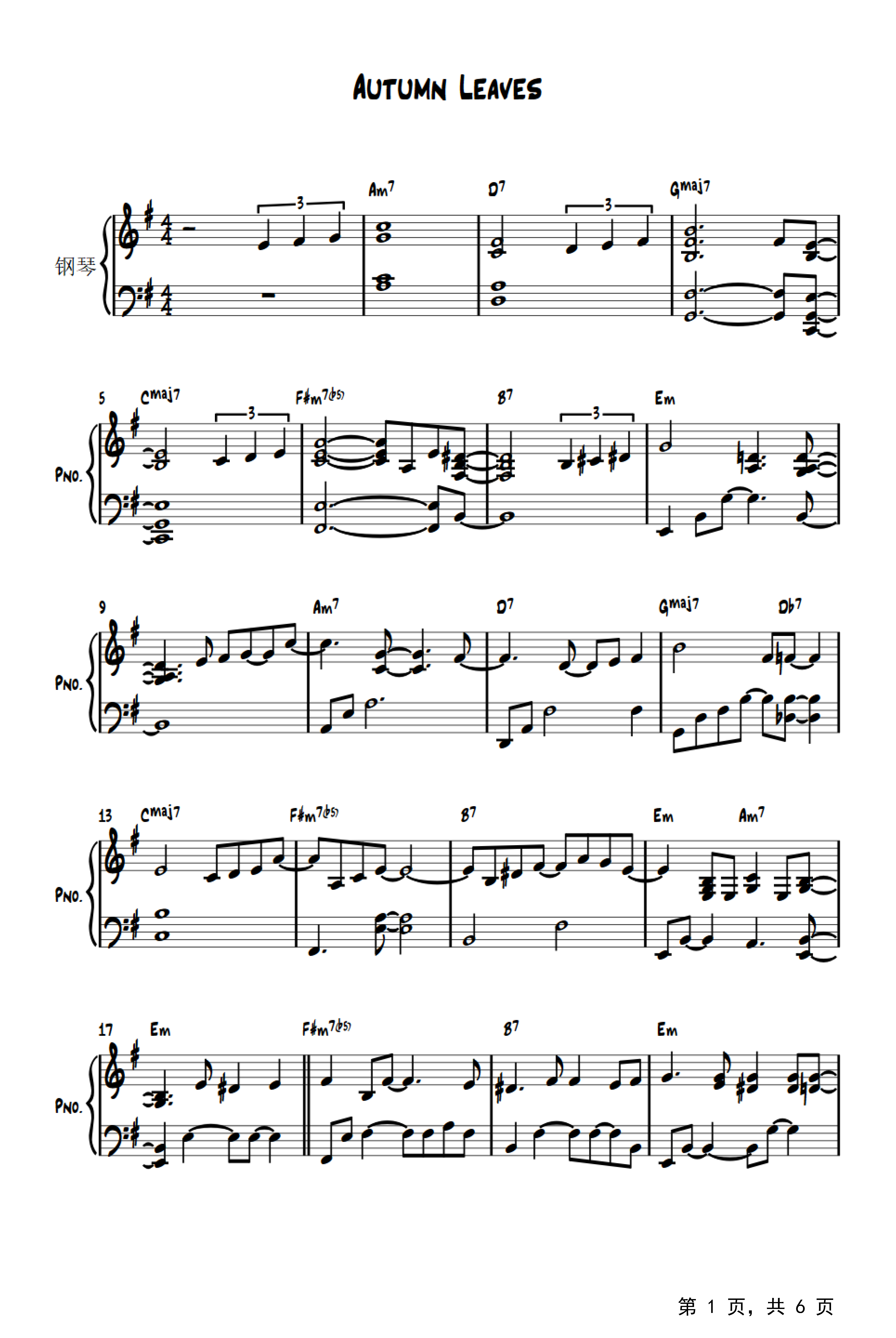 《Autumn Leaves》是作曲家Joseph Kosma(1905, Born Budapest, Hungary - Died 1969, Paris, France)在1945年于法国所创作的香颂。上世纪中叶,Jazz大乐队时期(1940-1954) 美国佐治亚洲艺人Johnny Mercer (1909-1976)将"Les Feuilles Mortes"改写成英文版的"Autumn Leaves"进口到了美国,之后在那里也大为风行。后来又出现在《廊桥遗梦》里,在弗朗西丝卡和罗伯特那段剪不断、理还乱的情感纠结中,在遥远的南依阿华乡间木屋摇曳的蜡烛光中,纳特.金.科吟唱的《Autumn Leaves》悠然响起,一段梦幻情缘就此上演。此后,罗布特在西雅图孤寂岁月中,一次次的在那间酒吧中聆听高音萨克斯手吹奏这段名曲。