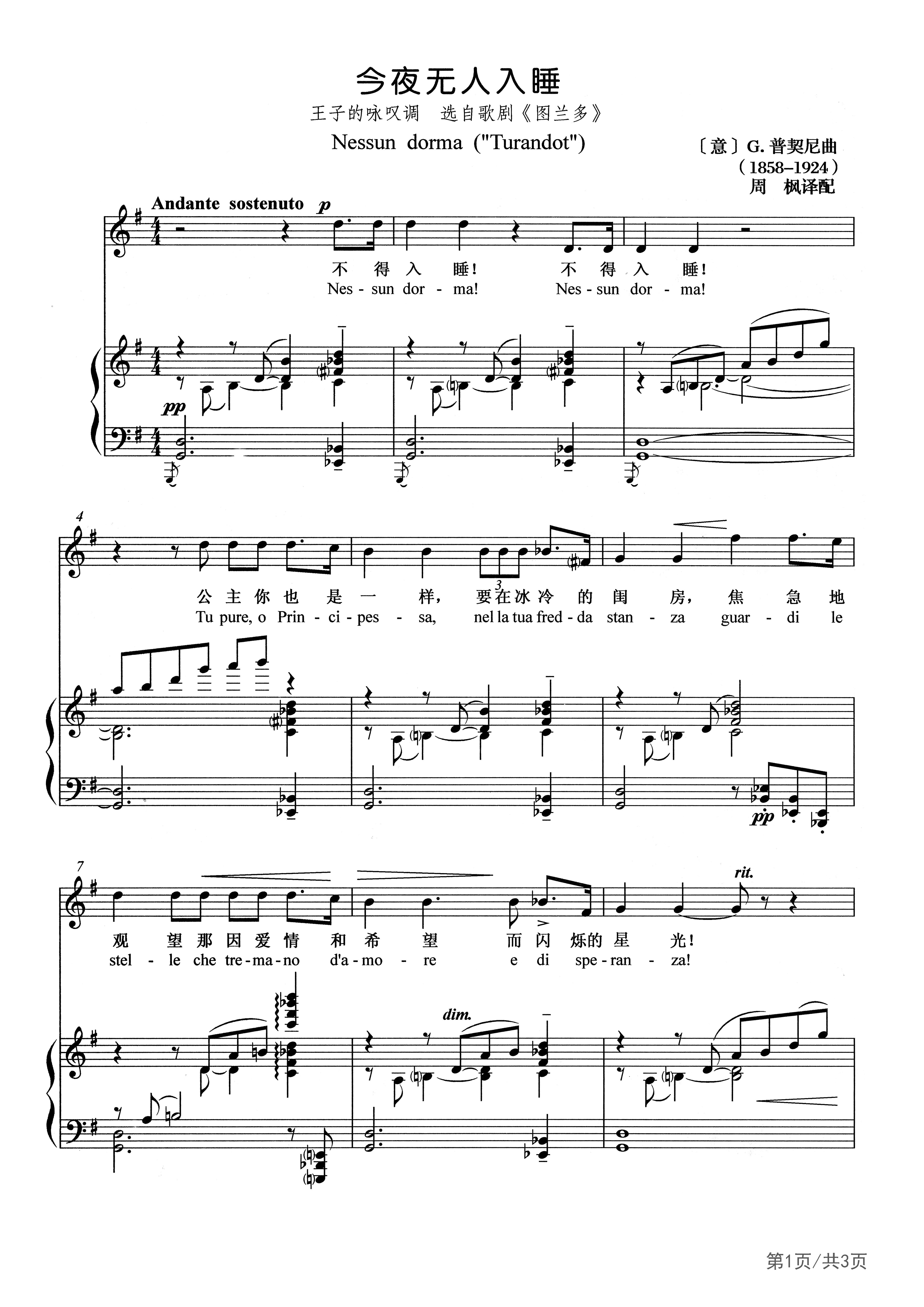 《今夜无人入睡》是意大利著名作曲家贾科莫·普契尼根据童话剧改编的歌剧《图兰朵(Turandot)》中最著名的一段咏叹调,剧情背景是鞑靼王子卡拉夫在要求公主图兰朵猜其身份。普契尼在1920年的夏天已正式决定要把描述男女之间爱与憎的"图兰朵公主" 改写为歌剧,他请剧作家阿达米(Giuseppe Adami)和记者席莫尼(Renato Simoni) 著手改写剧本。阿达米由于在1903年曾写过"C.Gozze" 这部戏剧,所以对 "图兰朵公主" 故事颇能掌握。至于席莫尼,他曾在1912年被 "晚间邮报" (Corriere della sera)派驻至北京一段时间,对中国的风俗有些了解。 "图兰朵公主" 剧本中不少令人感到惊讶、贴切的中国背景,应是他所提供的意见,而三位大臣于第二幕第一景的剧本可能完全出自他的手笔。《图兰朵》,三幕歌剧,普契尼作于1924年(未完成)。这是普契尼最后一部歌剧,在完成他计划作为该剧高潮的二重唱之前,癌症夺去了他的生命。这部作品最后一场由阿尔法诺于1926年替代完成。这部作品的脚本,由阿达米和西莫尼根据意大利剧作家戈济的同名戏剧撰写。