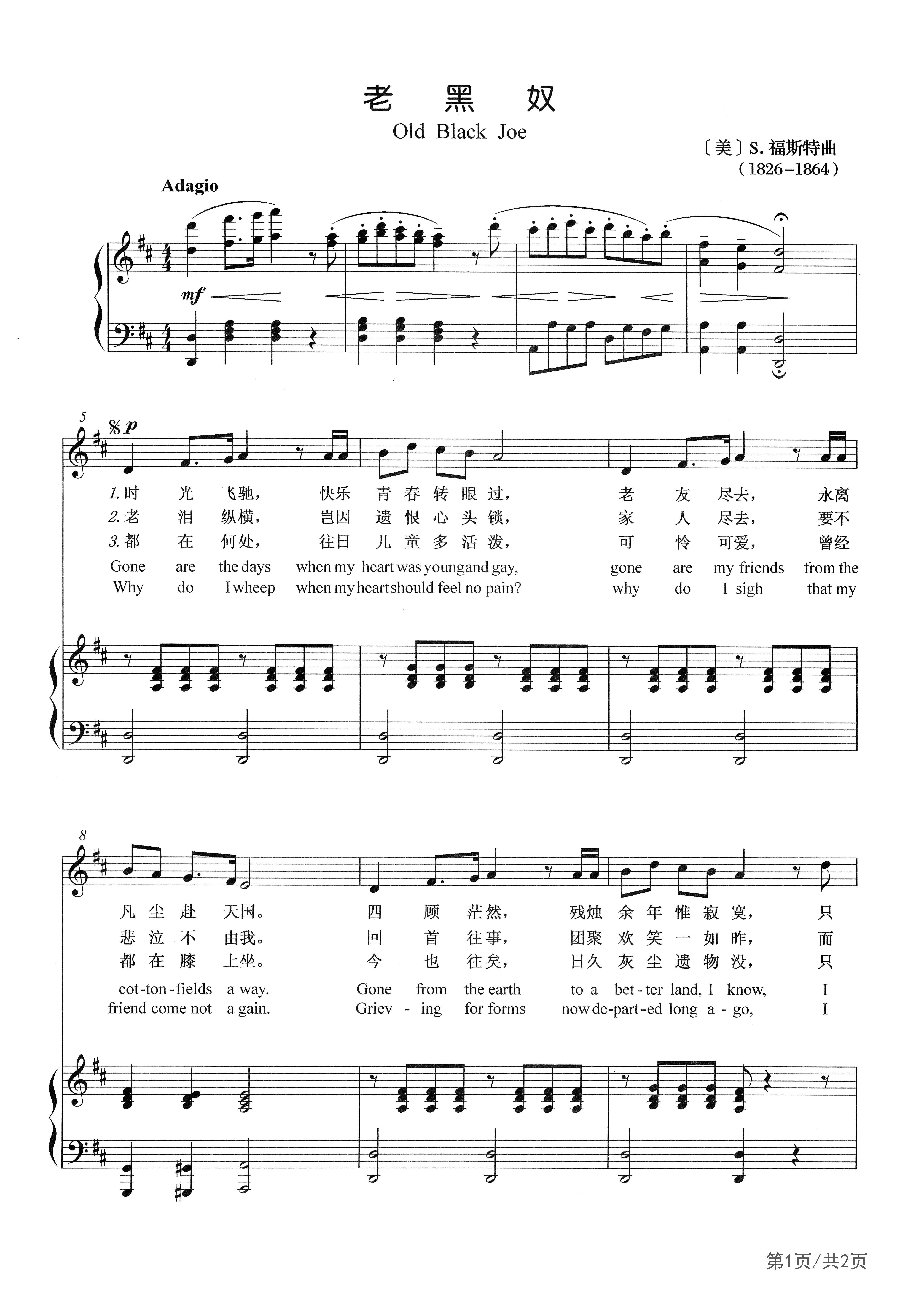 《老黑奴》是一首由史蒂芬·柯林斯·福斯特(1826-1864)创作的美国民歌,原名《old black Joe》。作者写作本曲除了寄托对老黑奴的哀思以外,也融进了对自己当时境遇的哀叹。这是福斯特1860年离开家乡彼得斯伯格去纽约之前写的最后一首歌。写这首歌的时候,福斯特一生热爱着的家乡和亲人,几乎都一去不复返了。可敬的父亲这时已经去世了,两个姊妹也已出嫁,远离了家乡,两个兄弟也相继故去,剩下的另一个弟兄摩利逊也已结婚,而且住到了克利夫兰。事实上,除了妻子和年幼的女儿之外,只有他一个人孤独地留在家乡彼得斯堡。此后福斯特又遭遇家庭婚变的悲剧,他被迫孤身流落到纽约,穷困潦倒,仅仅四年后就孤寂地离开了人世。曲名中的“老黑奴”确有其人,正是在1860年,福斯特的妻子琼家的一个老黑奴去世了。老黑奴生前要作者为他写一首歌,作者答应了。作者福斯特与这个老黑奴有着多年的交情,老黑奴的去世使作者深感悲痛。这首歌正是在这一背景下写的,旋律优美、亲切而又哀婉动人。显然,作者写作本曲除了寄托对老黑奴的哀思以外,也融进了对自己境遇的哀叹。