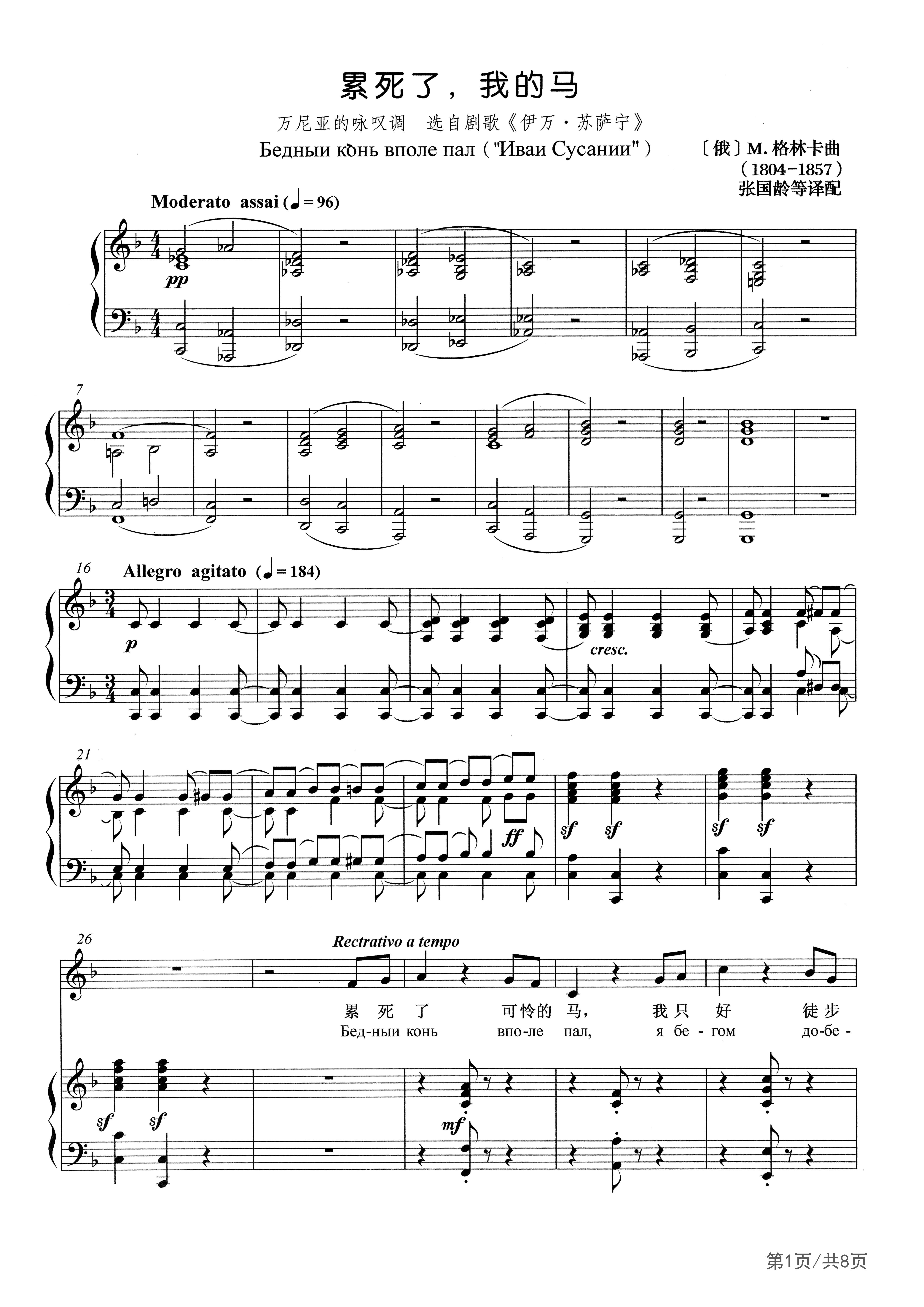 故事发生在1613年,当时波兰封建主入侵俄国,俄国人民在波扎尔斯基的领导下,组织了义勇军抗敌,并向莫斯科挺进。波军非常惊慌,派骑兵前往莫斯科支援被围困的部队。波军闯进农民苏萨宁的家,威逼他指点通往莫斯科的道路。苏萨宁急中生智,把敌军领入荒无人迹的森林,使侵略者在那里冻死、饿死,全军覆没。他自己从容就义,为祖国献出了生命。这是第一部用俄语演唱的歌剧,音乐充满了俄罗斯民族风格,虽极少直接引用民歌曲调,但民歌的精神实质和表现手法已化入其间,因此人们把它看作是第一部真正的俄罗斯民族歌剧。格林卡创造性地把西欧音乐文化的优秀成果和民族传统相结合,使这部歌剧成为具有高度艺术性的、获得国际声誉的俄罗斯歌剧。