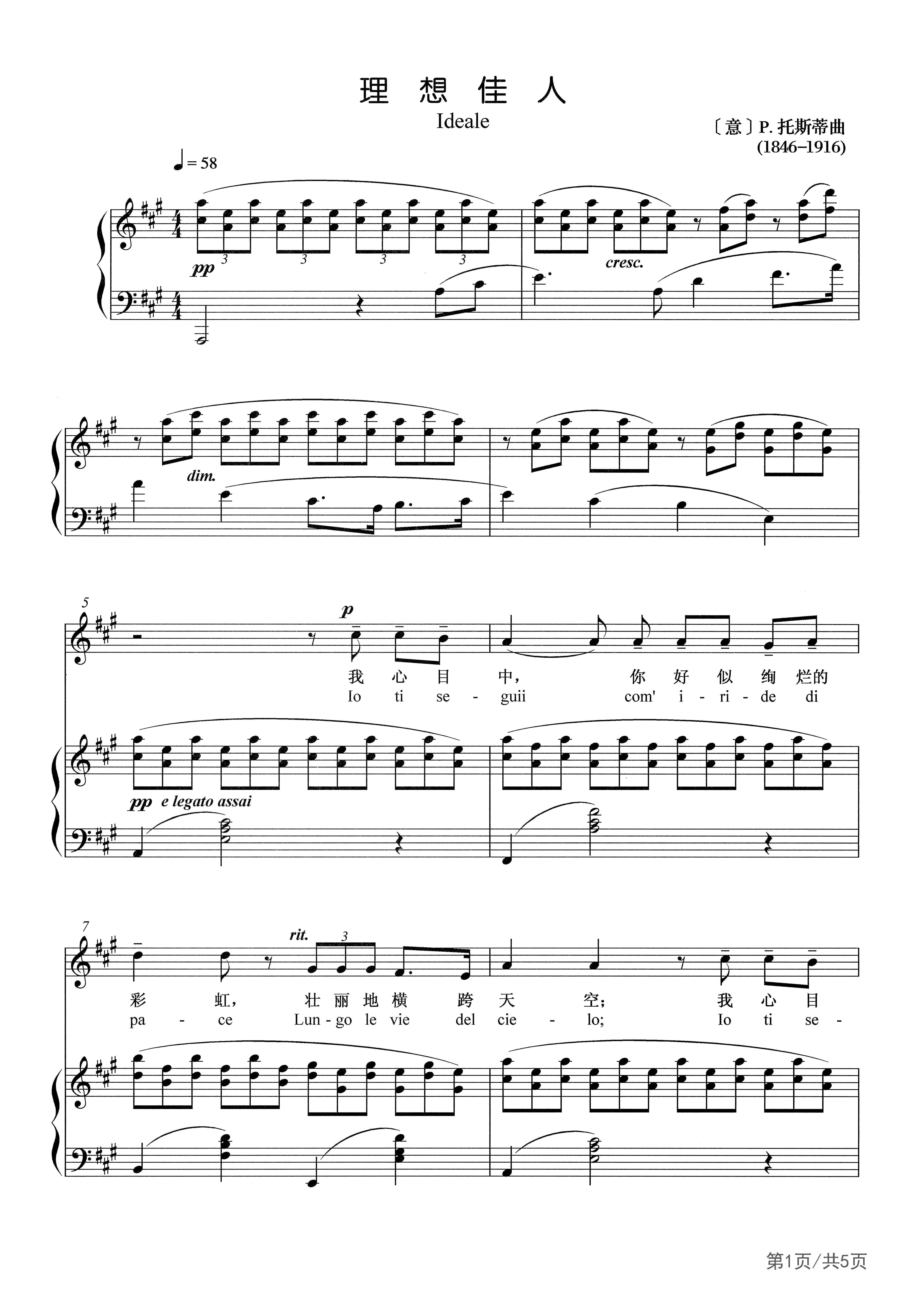 弗朗切斯科.保罗.托斯蒂(Francesco Paolo Tosti, 1846- 1916)意大利作曲家,生于意大利阿勃鲁齐省的奥尔托纳。-生中大部分时间在英国从事音乐创作和声乐教学活动,曾长期在伦敦的英国王室和和皇家音乐学院中教授声乐,1908年被英国王室封为爵士。他的作品以声乐为主,大多是英语的"客厅歌曲”,但从他写的旋律当中仍可表现出意大利民间音乐的风格。他的歌曲旋律平易优美、内容通俗易懂,多根据当时流行的抒情诗谱曲而成。《理想佳人》 是采用欧洲19世纪“沙龙音乐”的形式写成的。此作品抒发的是对心仪之 人的歌颂、向往的情感,整个歌曲在平缓的音调中进行,洋溢着对美丽佳人和幸福爱情的憧憬和期盼。