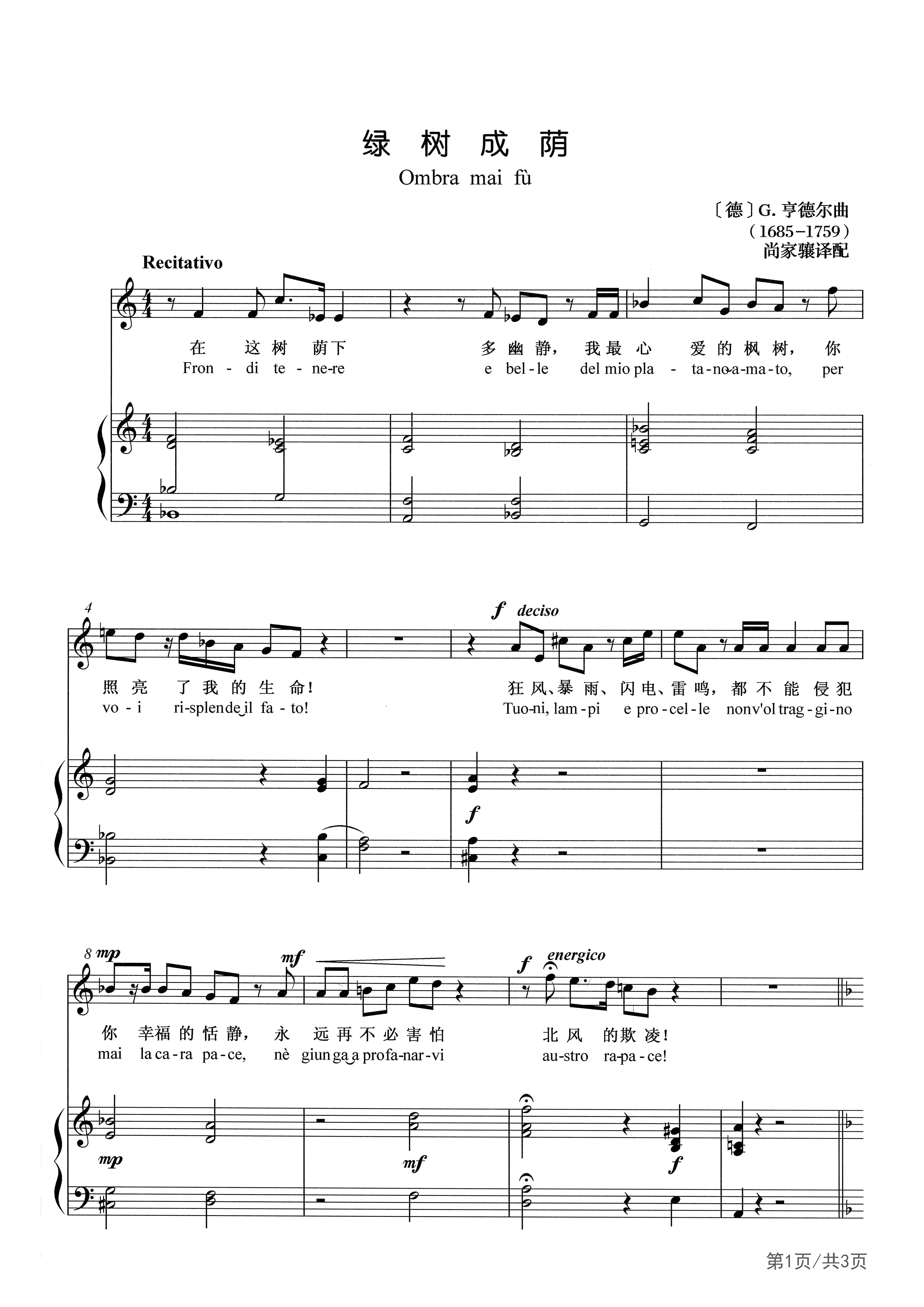 《绿树成荫》(Ombra mai fu)是亨德尔作曲的歌剧《塞尔斯》(Serse (Xerxes))中的咏叹调。作品的一些基本情况。作者亨德尔(1685-1759)是巴罗克时期的作家,在其浩瀚的作品中最有价值的是歌剧与清唱剧,其中《绿树成荫》选自于歌剧《赛尔斯》,赛尔斯是波斯国王,他背弃自己的未婚妻,爱上自己兄弟的恋人,于是千方百计拆散他们。最后阴谋暴露,有情人终成眷属。《绿树成荫》是赛尔斯的一个唱段,赛尔斯虽然行为丑恶,但亨德尔仍给予他优美的唱段,赛尔斯看到庭院中绿树成荫,不由地用歌声表达出了赞叹。