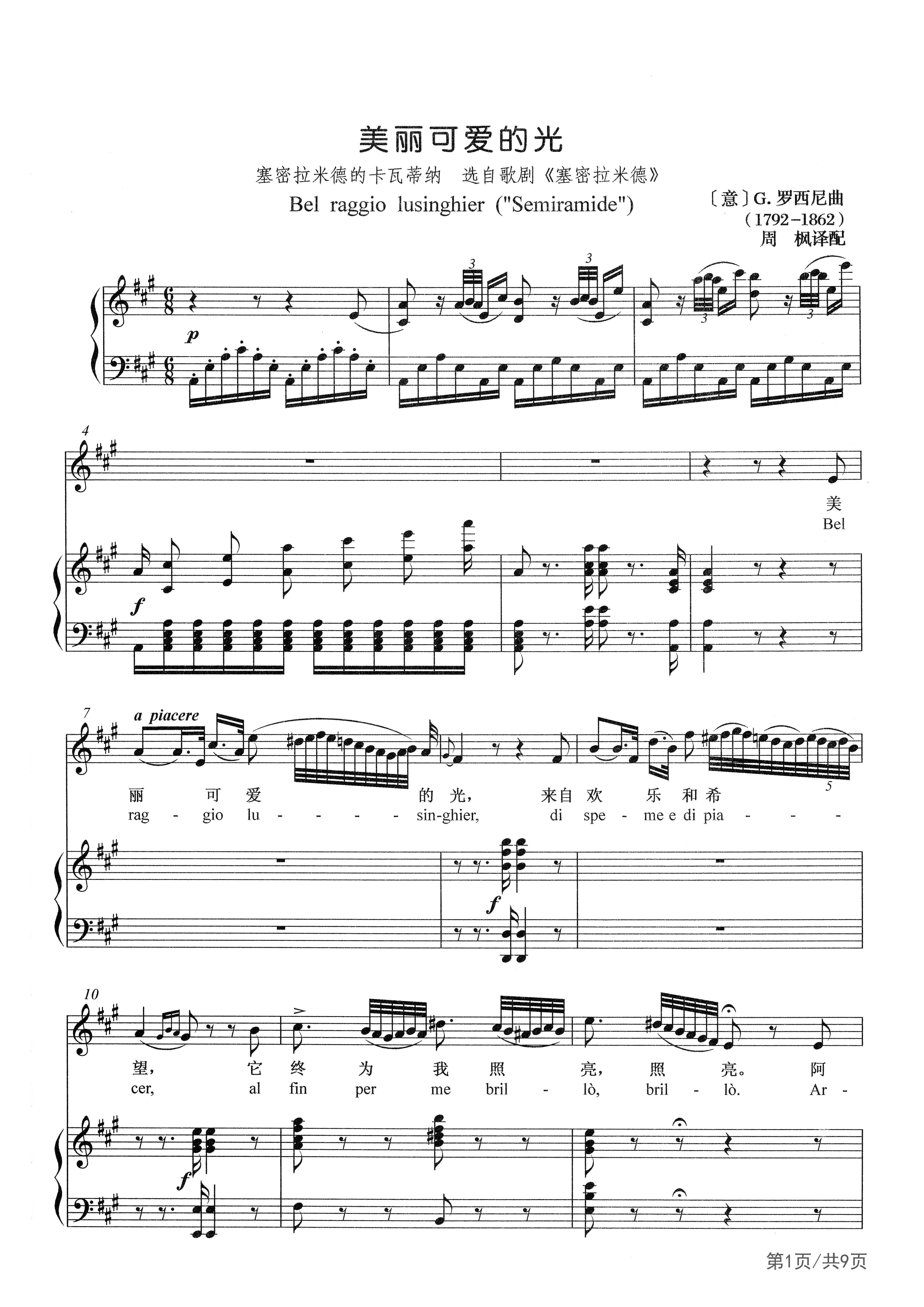 罗西尼是19世纪初期复兴意大利歌剧的领头人物。他一生创作了近40部歌剧,不仅有喜歌剧,也有正歌剧,他非凡的创作天赋使人为之倾倒。法国作家司汤达评论罗西尼曾说:“意大利有一个人,大家读论他比谈论拿破仑还多,这个人一位不过20来岁的作曲家”。1823年,二幕正歌剧(塞密拉米德)问世.剧本根据伏尔泰1748年首演的同名悲剧改编而成。内容讲述公元前18世纪巴比伦的皇后塞密拉米德的故事。这也是他创作的最后-部意大利语歌剧。《美丽可爱的光》是第一幕中塞密拉米 德所唱的咏叹调,它也是唱片中常常可以听到的名曲。在巴比伦皇宫的花园,塞密拉米德独自等待着阿尔微切。当仆人们进来报告说阿尔撒切即将凯旋归来,暗恋他的女王就唱出即将和阿尔撒切见面的快乐歌曲《美丽可爱的光》。该曲以它优美动人的旋律、快速高难度的花腔技巧以及难把握的戏刚形象成为花腔女高音挑战的经典曲目。