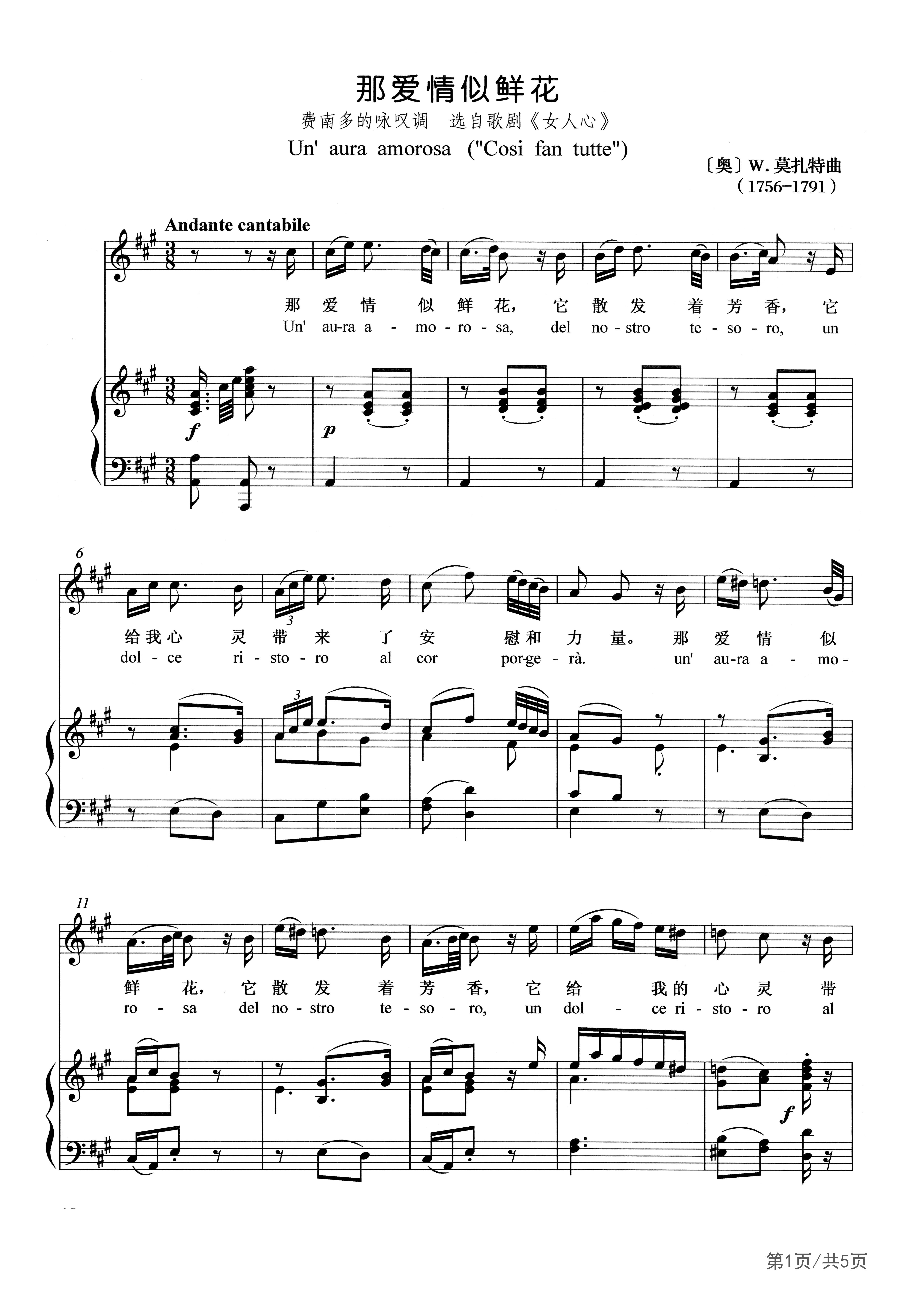 《女人心》是莫扎特后期创作的意大利喜歌剧(Opera Buffa)典范之一。1790年1月6日首演于维也纳布尔格剧院。它是莫扎特作品中最完美和平衡的一部。在今天它也被认为是最富于人情味的最优秀的喜剧之一。莫扎特的歌剧《女人心》直译应该是“女人都是如此”。原来歌剧的副标题是“恋人的学校”(La scuola degli amanti),但莫扎特不太喜欢这个副题,尽管剧作者Da Ponte更倾向于它,认为那更能说明剧作的意图。 两幕喜歌剧《女人心》,1790年首演于维也纳。它是莫扎特作品中形式最完美和平衡的一部。在今天它被认为是最富于人情味的最优秀的喜剧之一,是关于人性和人类感受,忠贞与不忠贞的微言大义。