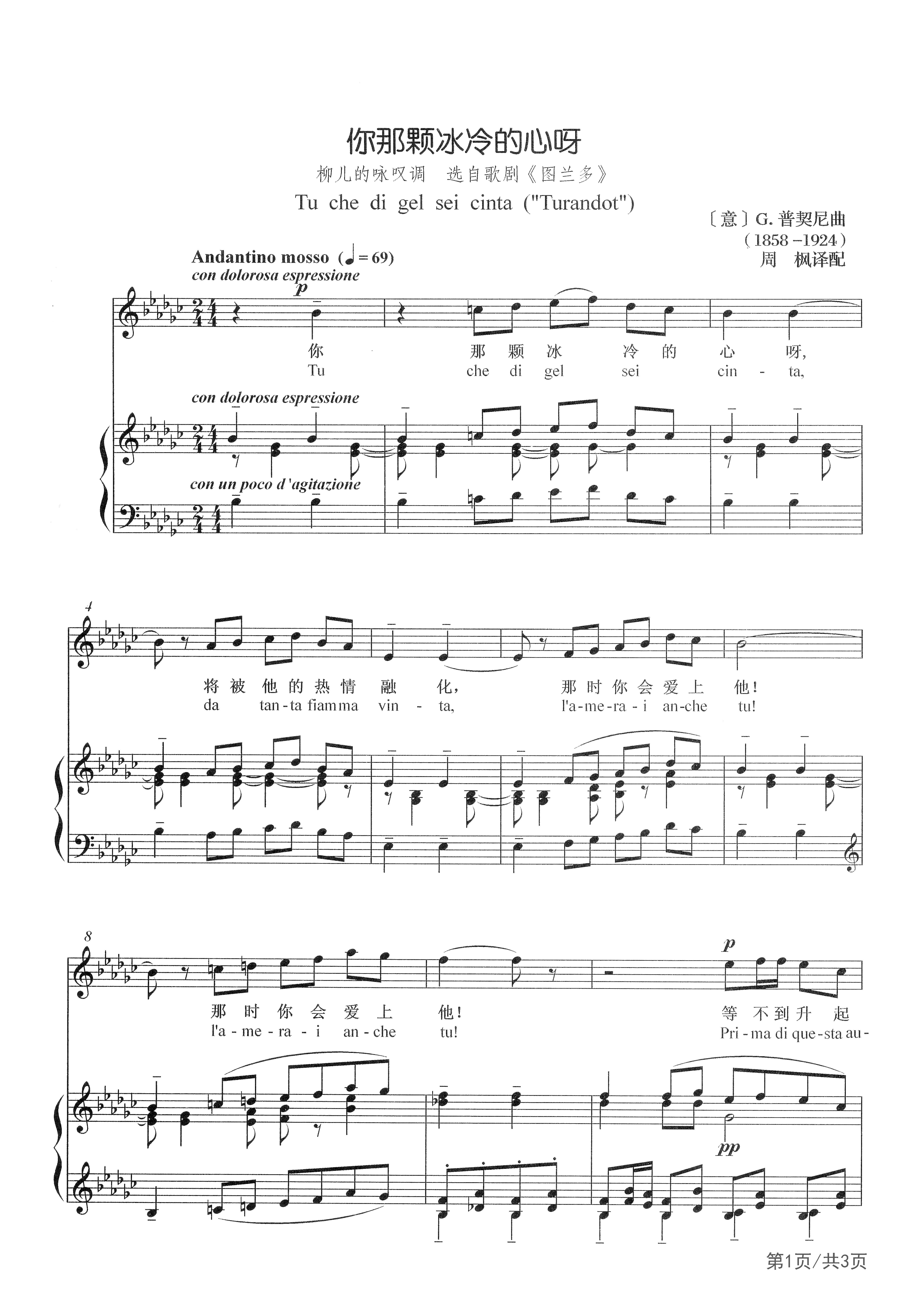 普契尼的歌剧旋律抒情流畅、优美动人感情丰富。《你那颗冰冷的心》 是他的歌剧《图兰朵》中仆人柳儿的一-段咏叹调。这首咏叹调把一个柔弱而又深情的姑娘为所爱的人作出牺牲的内心表现得淋漓尽致。普契尼,十九世纪上半叶意大利著名歌剧作曲家之一,创作歌剧十二 部。他的歌剧旋律抒情流畅、优美动人感情丰富。《你那颗水冷的心》是歌剧《图兰朵》中的味叹调。剧中描写的是图兰朵公主想违背成婚诺言逼迫柳儿说出卡拉夫的名字,深爱着王子的柳儿,闭口不说,经不住折磨决定自杀,这首咏叹调就是自杀前柳儿对图兰朵进行劝说时唱的。具有很强的抒情性,表现了柳儿的善良、忠诚柔弱和爱情的高尚。