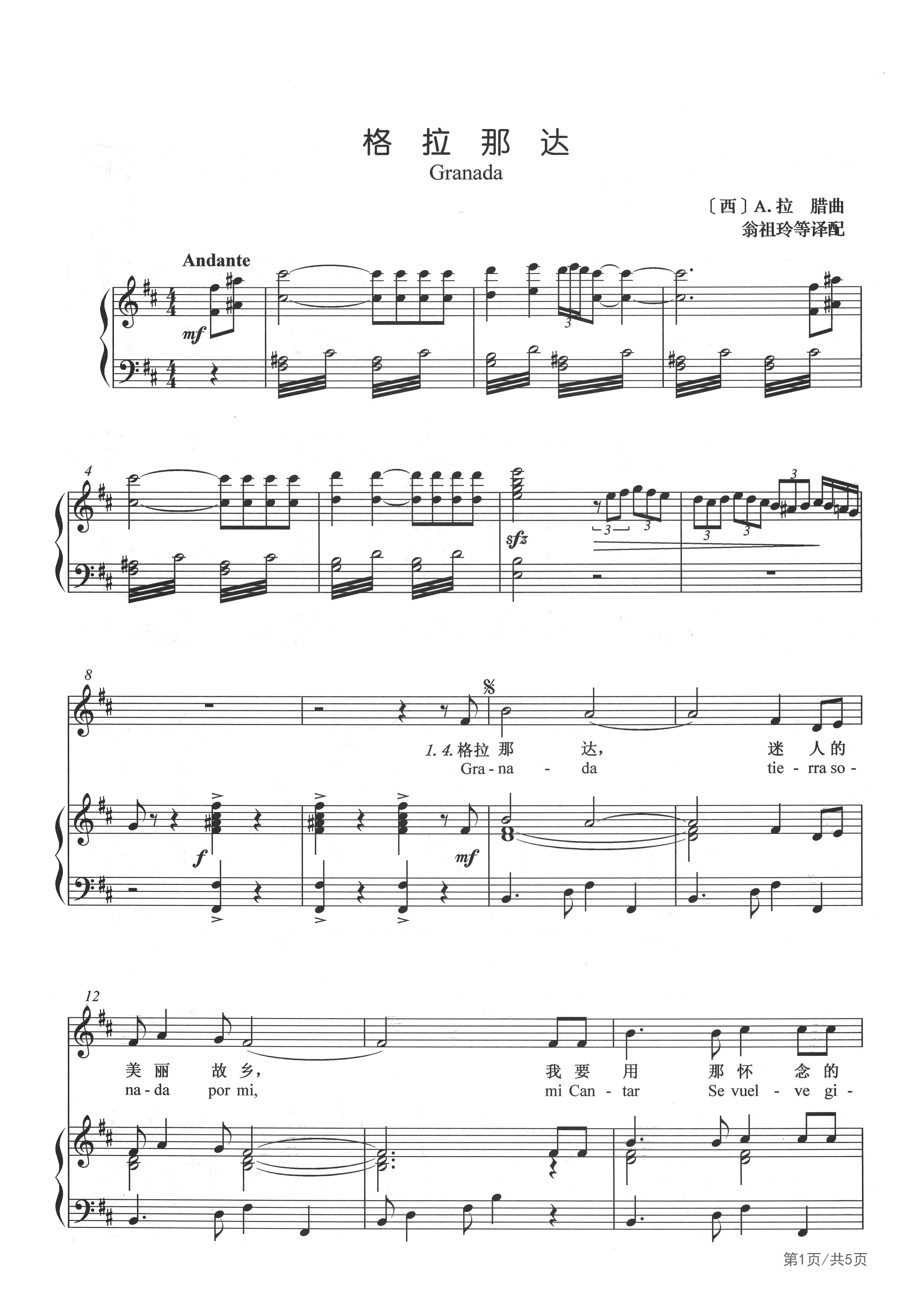 《格拉纳达》(Granada)是一首脍炙人口的西班牙语歌曲,是墨西哥作曲家奥古斯丁· 拉拉在1932年专门为西班牙城市格拉纳达所写的西班牙语歌曲,在男高音佩德罗·巴尔加斯首唱之后,这首歌就大受欢迎。这首作品以西班牙语版为主,也因旋律优美,鲜明的西班牙音乐风格而倍受世界歌唱家们的喜爱,«格拉纳达»也成为二十、二十一世纪的重要艺术歌曲之一。众多著名歌唱家都曾演唱过,比如那男高音歌唱家马里奥·兰扎,阿尔弗雷多·克劳斯,豪尔赫·内格雷特,卡雷拉斯,多明戈,帕瓦罗蒂,萨姆索诺夫等等。此外,很多女高音,女中音歌唱家也纷纷演唱«格拉纳达»,除美声唱法以外,也有爵士,流行,摇滚等版本。