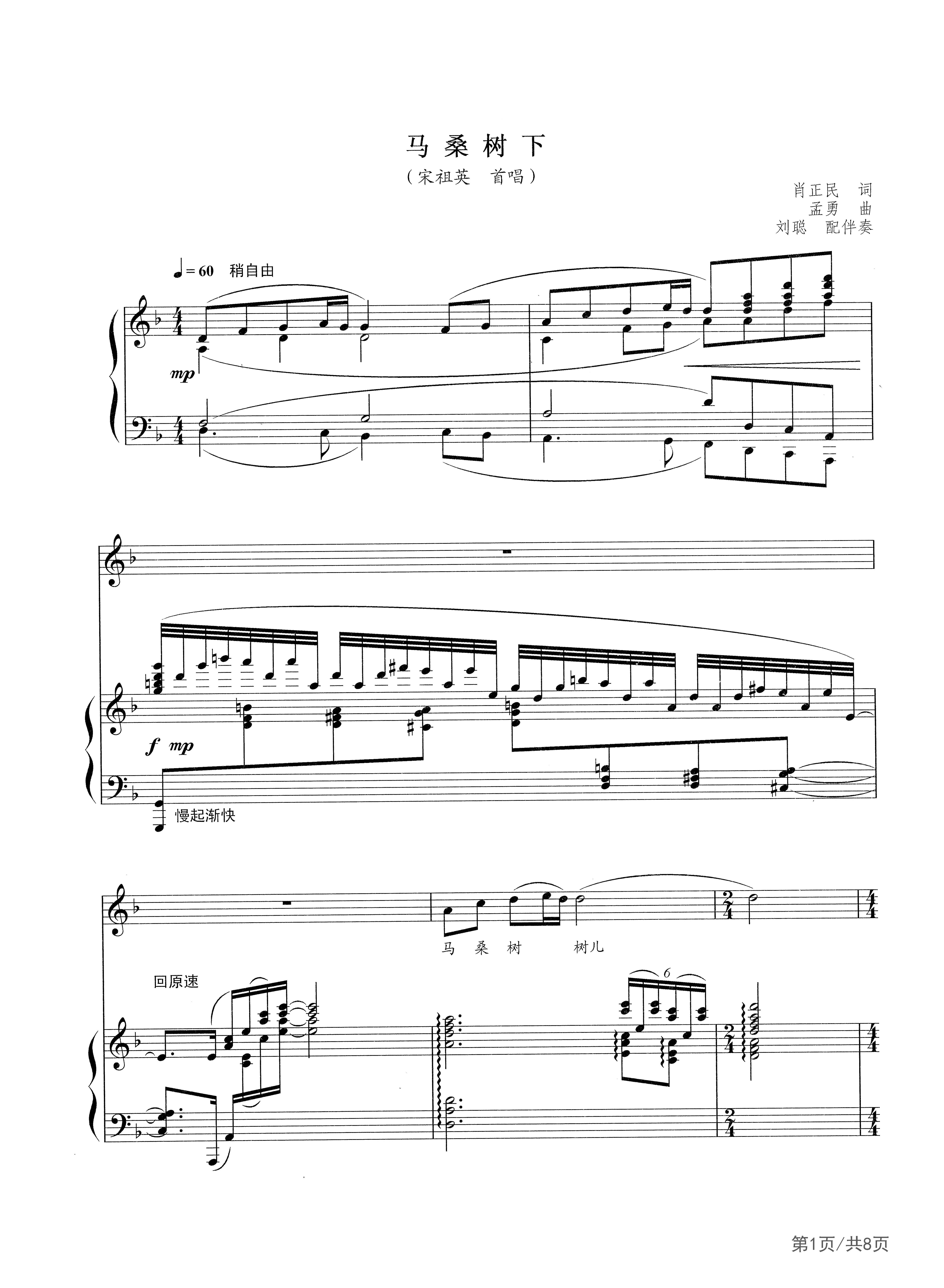 《马桑树下》由肖正民作词,孟勇作曲,宋祖英演唱。这首作品是根据湖南土家族桑植民歌《马桑树儿搭灯台》改编演绎发展而成,作者通过对地域日常生活的描绘,将一幅美妙的土家风情画展现在听众面前。作品其语言淳朴,感情真挚,动人心弦,是一曲少数民族的爱情颂歌。歌曲的音乐主导动机61 232 2,采用的是桑植民歌的基本旋律,并在此基础上尽情延伸和扩展。歌曲采用引子引入主题,民族风味浓郁,歌曲旋律优美,意境深远。整部作品篇幅较大,为三部曲式结构,层层深入,多次变化,借物抒情,表达了青年男女对爱情对幸福生活的向往与追求。