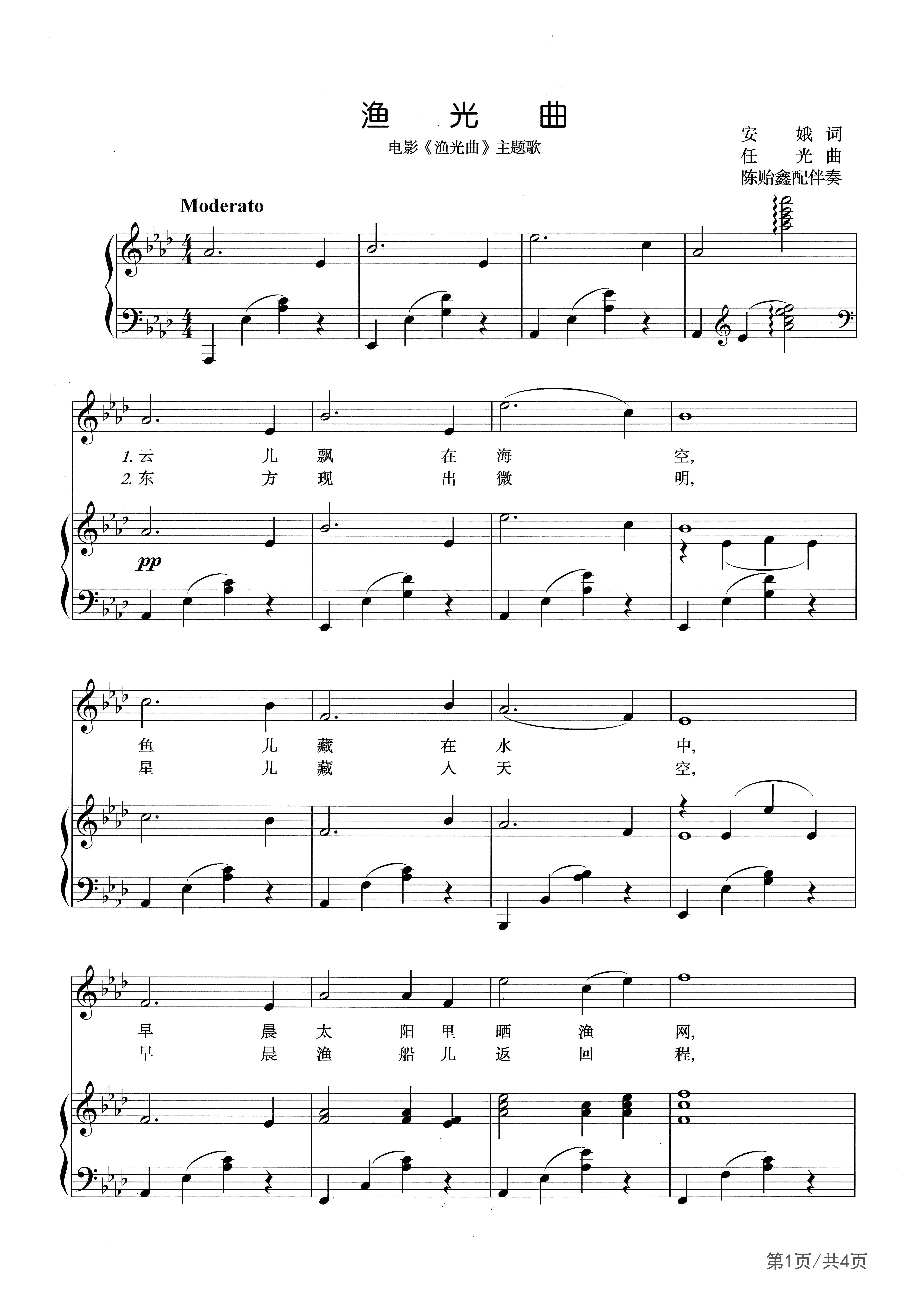 《渔光曲》是电影《渔光曲》主题曲,由安娥作词,任光谱曲,作于1934年。电影《渔光曲》主题歌。这首歌深情地唱出了旧社会长年漂泊在海上的穷苦渔民的艰辛劳动生活,真实地反映了渔民们愁苦困顿的心情。为了写好这首歌,任光特意到长江的入海口吴淞口,观察渔民们捕鱼劳作。根据体验,他为这首歌创造了表现海浪起伏的特定节奏,突出了船歌的风格。 1934年6月14日影片首映后,这首歌迅速传播开来,第二年,因影片获得莫斯科展出汇演荣誉奖而蜚声海外。聂耳曾撰文说:《渔光曲》一出……其轰动的影响甚至形成了后来的影片要配上音乐才能够卖座的一个潮流。